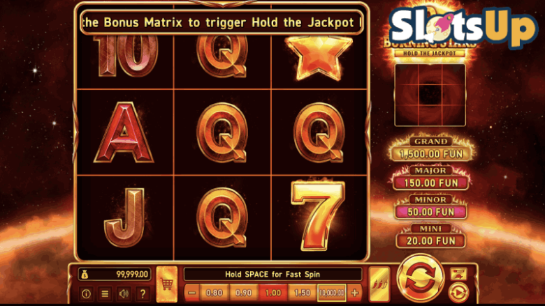 Kun pelaat 9 Burning Stars -peliä, huomaat, että kiekoille ilmestyy lisäsymboleita. Nämä ovat palavia aurinkoja, joissa on numeroita. Tämä tallentuu sitten Bonusmatriisiin, joka löytyy peliruudun oikeasta yläkulmasta. Kun tämä on täynnä, Hold the Jackpot -bonuskierros aktivoituu.Kaikki tallennetut aurinkosymbolit kerääntyvät yhdeksi arvoksi, ja ne näkyvät keskimmäisellä rullalla toiminnon aikana. Tämän jälkeen saat 3 uudelleenpyöräytystä, ja jos uusia aurinkosymboleita osuu kohdalle, ne jäävät kiinni ja nollaavat uudelleenpyöräytyslaskurin arvoon 3. Mini-, Minor- ja Majorjackpot-symbolit voivat myös osua kohdalle ja tehdä saman. Näistä saat myös vastaavan jättipotin.Mystery-symboli voi myös muuttua miksi tahansa muuksi bonussymboliksi tämän kierroksen aikana. Jackpot Mystery -symboli muuttuu joksikin kolmesta jackpot-symbolista.Tämä kierros päättyy, kun kaikki paikat on täytetty tai uudelleenpyöräytyslaskurin lukema laskee nollaan. Kun kaikki 9 paikkaa katetaan bonussymboleilla, voit voittaa Grand Jackpotin, joka on 1 500 kertaa panoksesi suuruinen.