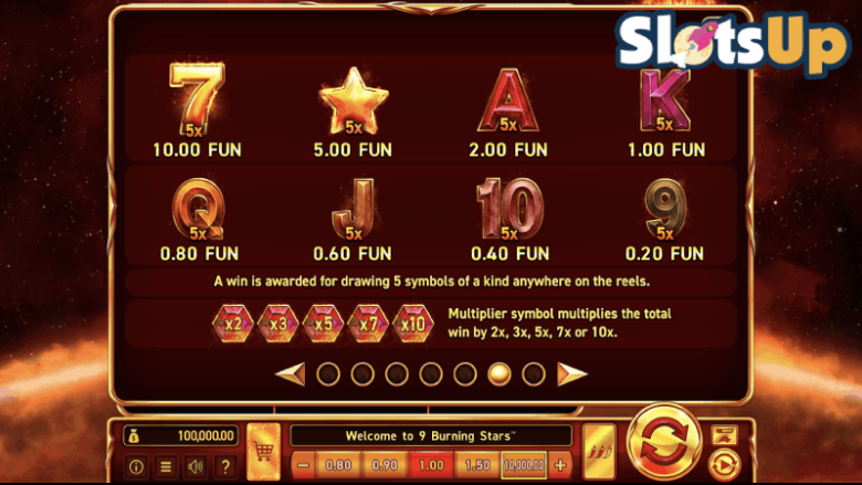 Mikä nettikolikkopelissä erottuu sinusta eniten? Jos se on grafiikka ja yleinen pelattavuus, 9 Burning Stars todennäköisesti miellyttää. Ruudukossa on 9 paikkaa, jotka pyörivät toisistaan riippumatta. Muodostat pelissä voittoja pyöräyttämällä vähintään viisi samanlaista symbolia näkyviin missä tahansa ruudukossa. Tämä on melko ainutlaatuinen skenaario, varsinkin pelissä, jossa on 3x3-rakenne.Suosittelen, että pelaat 9 Burning Starsia demotilassa ennen oikean rahan käyttöä. Molemmissa tapauksissa sinun on valittava pankkikassallesi sopiva panos. Kolikkopelin käyttöliittymän alaosassa on laaja valikoima panostusarvoja, alkaen 0,20 dollarista per kierros. Enimmäisarvo, jonka voit valita asteikon toisessa päässä, on 10 000 dollaria per kierros. On myös merkittävää huomata, että voit valita kiekon pyörimisnopeuden automaattisen pelitoiminnon yläpuolella olevalla painikkeella.