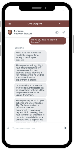 Abu King -kasinon verkkosivuilla kerrotaan, että Live Chat on käytettävissä 24/7, ja testasin sitä eri aikoina - sain aina vastauksen heti. Agentit vastasivat aina yksityiskohtaisesti ja tekivät parhaansa auttaakseen kaikessa.