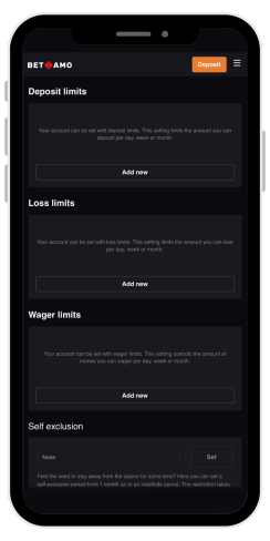 Betamo-kasino tarjoaa erittäin hyvin suunnitellut vastuullisen pelaamisen työkalut. Voin sanoa, että se aidosti välittää pelaajien turvallisuudesta. Ensinnäkin asiaankuuluvassa osiossa on luettelo hyödyllisistä järjestöistä. Siellä on myös linkkejä palveluihin, jotka auttavat estämään alaikäisten pääsyn pelisivustoille. Osio sisältää myös yleisiä neuvoja ja linkin itsearviointikyselyyn mahdollisen riippuvuuden tunnistamiseksi. Betamo-nettikasino tarjoaa useita rajoja ja vaihtoehtoja, jotka pelaajat voivat asettaa itse suoraan tilinsä kautta. Näitä ovat: talletusrajat, tappiorajat, panosrajat, itsestään poissulkeminen, jäähdyttely, istuntoraja ja reality check. Jokaisen työkalun avulla voit valita tietyt asetukset - esimerkiksi kaikki rajat voidaan asettaa päivää, viikkoa tai kuukautta kohden.