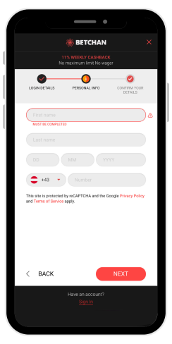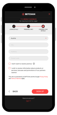 Sinun on täytettävä sähköpostiosoitteesi (BetChan-kasinotunnus), salasanasi ja valittava valuutta. Sinun on myös rastitettava ruutu, jossa vahvistetaan, että olet vähintään 18-vuotias ja että hyväksyt tietosuojakäytännön ja käyttöehdot.