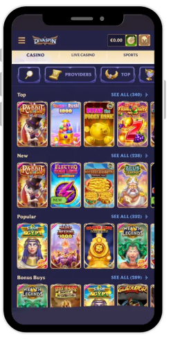 Pelaajien saatavilla on laaja valikoima DivaSpin-pelejä. Palveluntarjoajien saatavuutta voi tarkastella myös täältä. Ne löytyvät helposti hakupalkin avulla syöttämällä pelin nimi, kategoria tai palveluntarjoaja. Kategorioihin kuuluvat TOP, Uudet, Suosittu, Bonusostot, Live-pelit, Megawayt, kolikkopelit ja pöytäpelit.
