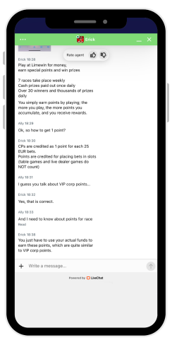 Sivustolla on myös linkit Live Chatiin, jota käytin myös aktiivisesti. Vaikutelmani sen suorituskyvystä on kuitenkin ristiriitainen. Positiivista on se, että agentti ottaa välittömästi yhteyttä mihin vuorokauden aikaan tahansa. Sain nopeat vastaukset joihinkin kysymyksiin ja pystyin asettamaan limiittini hyvin nopeasti agentin avustuksella. Mutta oli myös asioita, joita en pystynyt selvittämään. Kysyin esimerkiksi useita kertoja tiettyjen Limewin-kasinokampanjoiden ehdoista, mutta en saanut koskaan tarkkoja vastauksia.