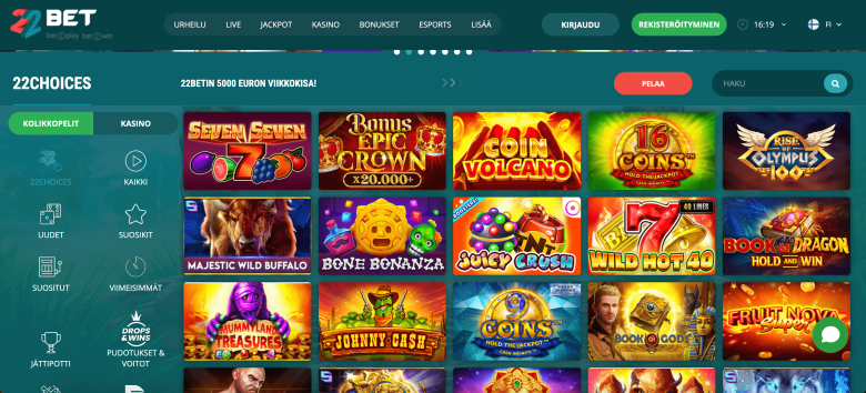 Suomalaiset, jotka etsivät matalan talletuksen kasinoa, arvostavat 22Betiä. Se tukee 1 euron minimitalletusrajaa ja suomalaisille pelaajille ystävällisiä pankkitoimintoja. Olipa kyseessä paikallisen Nordea-pankin Visa-kortti tai sähköinen lompakko, 22Bet hyväksyy maksun sopivan euromääräisen rajan puitteissa ja käsittelee tapahtuman nopeasti. Pelikokoelma on täynnä suosittuja kolikkopelejä, eSports-nimikkeitä ja muita ohjelmistotyyppejä. Tekemällä 1 euron talletuksen pääset käsiksi kolikkopeleihin, kuten Fear of Win, pikavoittonimikkeisiin, kuten Higher vs Lower, pöytäpeleihin, kuten Killer Clubs, ja live-osioon, jota toimittaa yli 15 palveluntarjoajaa, mukaan lukien Pragmatic Play ja Evolution. Virallisella sivustolla on kieliversio suomalaisille sekä mahdollisuus valita Suomi ja euro rekisteröinnin yhteydessä.