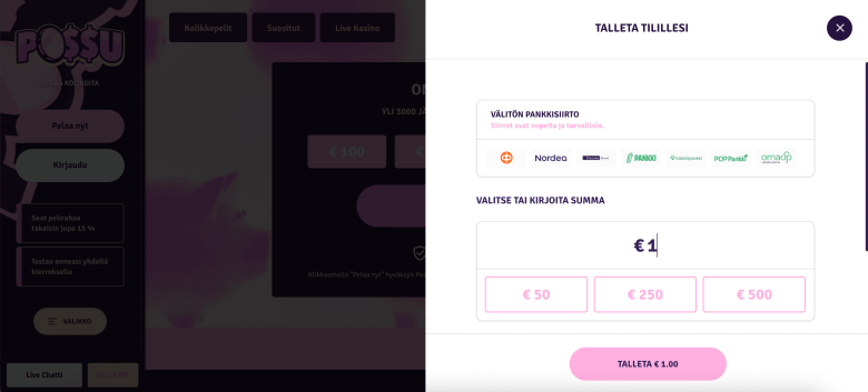 Possu Casinon testaamisen jälkeen voimme suositella sitä myös suomalaisille. Sivusto on suunniteltu täysin suomalaisille pelaajille. Sen kielet ovat englanti tai suomi (Suomi), mikä tekee siitä täysin optimoidun paikallisille. Sivusto hyväksyy euroja ja antaa pelaajille mahdollisuuden tehdä 1 euron talletuksia e-lompakoiden ja pankkikorttien kautta, olipa kyseessä sitten paikallinen tai maailmanlaajuinen pankki. Alatunnisteessa näkyy luettelo suosituista hyväksytyistä pankeista, kuten Nordea, Swedbank, SEB, Danske Bank ja Luminor. Sivustolla on hyödylliset usein kysytyt kysymykset ja intuitiivinen käyttöliittymä, vaikka peliosiosta puuttuvat kehittyneet suodattimet useimpiin kilpailijoihin verrattuna. Suomalaiset voivat kuitenkin lajitella ohjelmistoja palveluntarjoajien mukaan, jotka ovat suosittuja tuotemerkkejä, kuten BGaming, NetEnt, Play’n GO ja Pragmatic Play. Tällaisen monipuolisuuden ansiosta Possu Casino sopii pienille pelikassoille. Nykyiset pelaajat arvostavat myös 15 prosentin päivittäistä käteispalautusta.